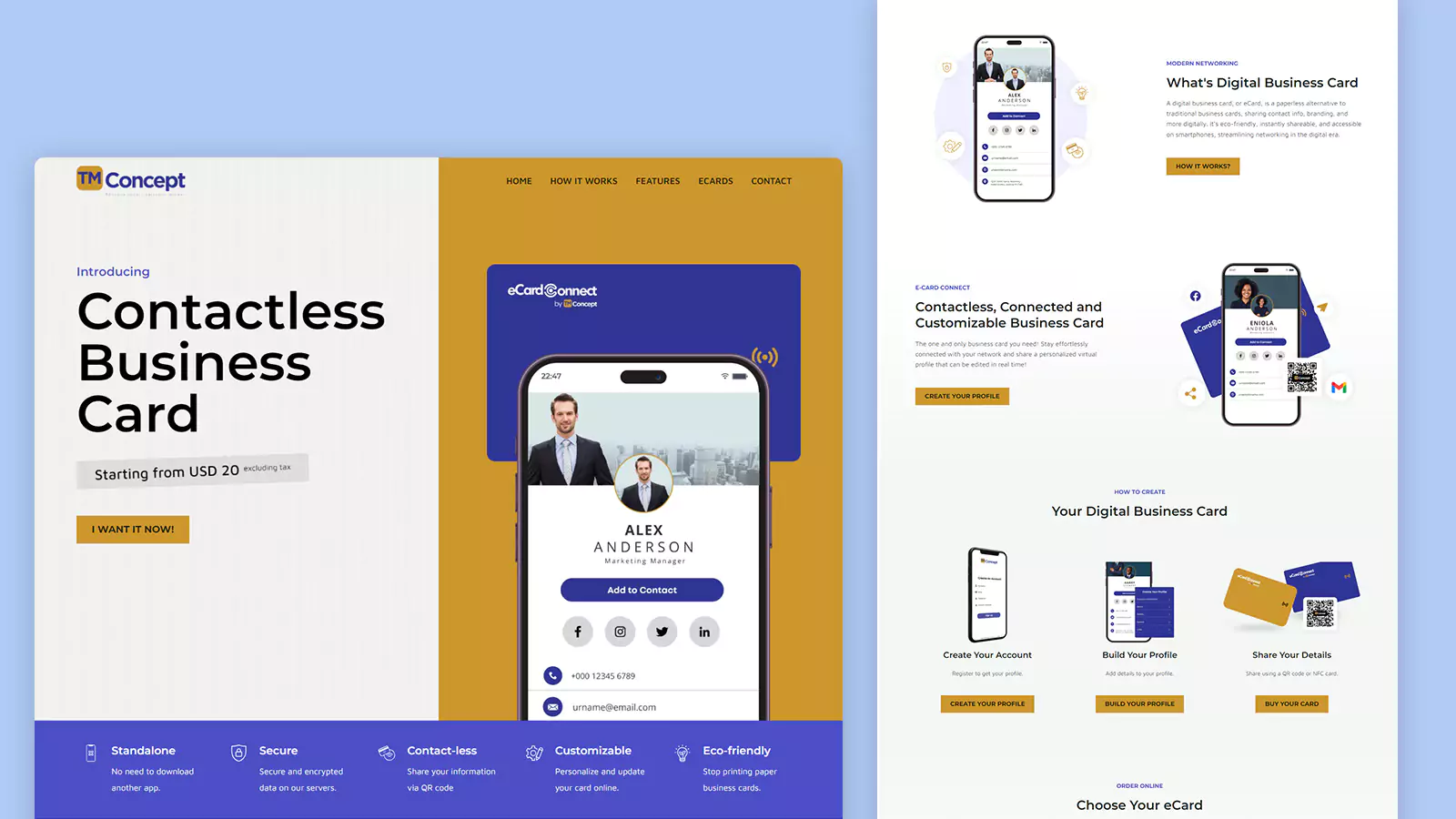 Digital business card system for TMConcept, featuring QR and NFC tap-to-share tech.
